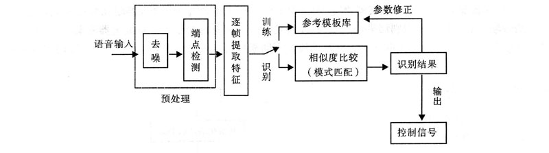 語音信號模板建立後便進入語音識別模式,當電動車庫門有語音信號輸入時,通過程序控製進行逐條語音信號模板匹配,識別出命令人所發出的語音命令,根據識別出的不同命令發出相應的控製信號,完成命令信號所要求的控製動作,實現語音控製.電動車庫門語音控製的原理如下圖所示: